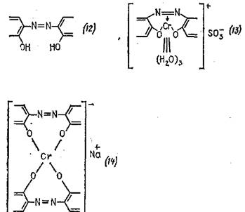 Первые протравные азокрасители были получены в 1878 г. на основе салициловой кислоты. В 90-х годах появились протравные красители, содержащие оксигруппу в opтo-положении к азогруппе, среди которых наиболее интересны О, О'-диоксиазокрасители. Затем появились уже содержащие металл протравные красители (неоланы, палатины), что избавляло красильщиков от необходимости протравливать ткань. Крашение ими проводят как обычными кислотными красителями. Позднее, в 1919 г. фирмой «Циба» были выпущены металлкомплексные азокрасители 1:1, а в 1951 г. — металлкомплексы 1:2 (фирма «Гейги»), которые дают особенно ровные и прочные окраски. Строение этихкрасителей в общем виде показано формулами.