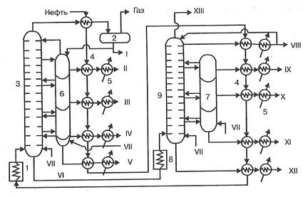 1 — трубчатая печь подогрева нефти, 2 — сепаратор газа, 3 — ректификационная колонна атмосферного давления, 4 — теплообменники-конденсаторы, 5 — холодильники, 6, 7 — отпарные колонны, 8 — трубчатая печь подогрева мазута, 9 — вакуумная ректификационная колонна. I — бензин, II —лигроин, III — керосин, IV — дизельное топливо, V — газойль, VI — мазут, VII — пар, VIII — веретенное масло, IX — машинное масло, X — легкое цилиндровое масло, XI — тяжелое цилиндровое масло, XII — гудрон, XIII — газы