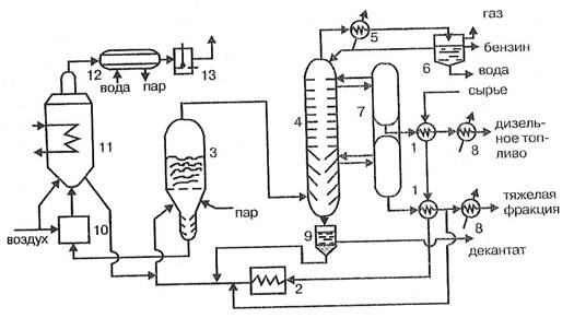 Сырье через теплообменники 1 подается в печь 2. Нагретое сырье смешивается с рециркулятом поступает в реактор крекинга 3. В нижнюю отпарную зону реактора вводится водяной пар для отдувки катализатора. Пары продуктов реакции и водяной пар из верхней части реактора 3 поступают в нижнюю часть ректификационной колонны 4. Пары бензина и водяной пар отбираются с верхней части колонны, проходят холодильник-конденсатор 5 и поступают в сепаратор 6, в котором разделяются на водяной слой, бензиновый слой и газ. Газ компрессируется и подается на газофракционирование, а бензин поступает на ректификацию. Часть бензина отбирается на орошение колонны.
