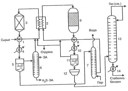 1, 8 – теплообменники, 2 – печь двухсекционная, 3 – реактор гидроочистки, 4,10, 14 – холодильники, 5 – сепаратор гидроочистки, 6 – этаноламинный абсорбер, 7 – отпарная колонна, 9 – реактор платформинга, 11 – сепаратор платформинга высокого давления, 12 – сепаратор платформинга низкого давления, 13 – колонна стабилизации