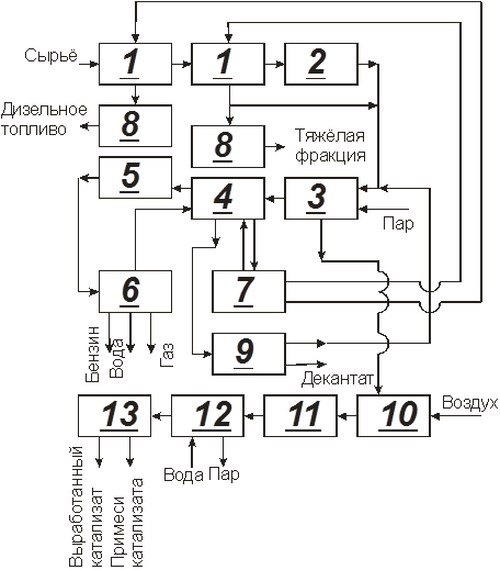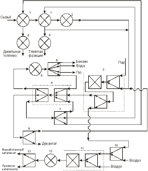 Для установления оптимального характера и порядка взаимодействия отдельных аппаратов в производственном процессе рассмотрим технологическую производства бензина в процессе крекинга (рис. 2).