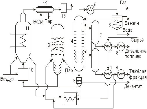 Дезактивированный в процессе работы катализатор из кипящего слоя реактора опускается в его отпарную зону и катализаторопроводом отводится в узел смешения с воздухом 10. Из него за счет воздушного потока катализатор переносится в регенератор 11, в котором создается кипящий слой. Основная часть воздуха для выжигания катализатора подается непосредственно в регенератор. Газы, образовавшиеся в результате выжигания кокса, проходят котел-утилизатор 12, электрофильтр 13 для улавливания катализаторной пыли и выбрасываются в атмосферу. Регенерированный катализатор из нижней части регенератора 11 поступает в катализаторопровод и вместе с сырьем и рециркулятом возвращается в реактор 3.