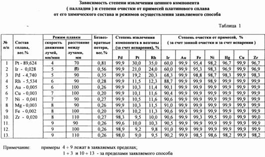 Тепловой баланс плавки двумя лучами подобран таким образом, что в области между зонами термического воздействия лучей позволяет одновременно осуществляться двум процессам: направленной кристаллизации с перекристаллизацией сплава, формирующей твердую фазу, и активному испарению ценного компонента из состава находящейся с ней в равновесии жидкой фазы. Создаваемое за счет операций режимов заявляемого способа подвижное равновесие этих процессов позволяет стабильно осуществлять разделение платины и ценного компонента.