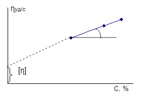 Для этого строим график зависимости ηуд/с от концентрации раствора. Экстраполируем график к оси ординат, величина отрезка отсекаемого на оси- характеристическая вязкость[14].