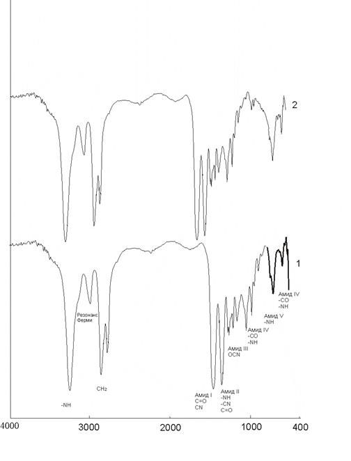 Наблюдаемые в спектре стандартного ПКА полосы (рис.2, кривая 1) могут быть интерпретированы следующим образом: полоса 3306 см-1 – валентные колебания –NH групп; 3078 см-1 – резонанс Ферми; 2924 и 2859 см-1 – колебания CH2 – групп с поляризацией параллельно и перпендикулярно плоскости молекул соответственно; 1640 и 1547 см-1 – полосы Амид I и Амид II. Полоса Амид I соответствует валентным колебаниям С=О и СN групп. В полосу Амид II вносят вклад колебания различных групп: NH – деформационные колебания (50%), СN – валентные колебания (10%). 1262 и 1200 см-1 – полоса Амид III, обусловленная взаимодействием валентных симметричных колебаний ОСN-групп и деформационными колебаниями NH-групп; 900-1000 см-1 полоса Амид IV – скелетные колебания фрагмента CONH; 690 см-1 – полоса Амид V – деформационные колебания свободной NH-группы перпендикулярно к плоскости амидной группы; 582 см-1 – полоса Амид VI – деформационные колебания С=О, происходящие перпендикулярно к плоскости амидных групп (-СО-NH-).