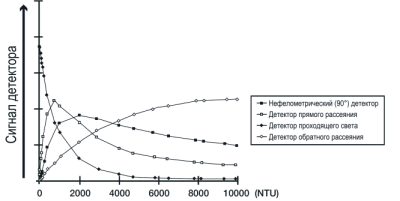 Этот детектор чувствует свет, рассеиваемый очень мутными образцами, когда прочие детекторы уже не дают линейного сигнала. Применение данного детектора расширяет диапазон измерений до 10 000 NTU. На рис. 4показано соотношение между рассеянием света и мутностью, определяемое различными детекторами в турбидиметрах Hach.