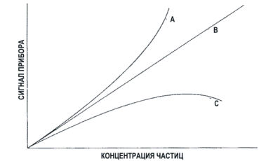 Рис. 5. Зависимость сигнала прибора от концентрации частиц при различной оптической геометрии