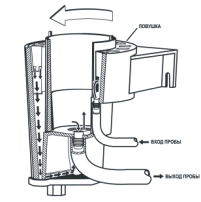 Источник света и детектор смонтированы над корпусом турбидиметра и, таким образом, изолированы от пробы. При таком расположении оптических узлов им практически не требуется обслуживание. Проба попадает в центр корпуса, поднимается вверх и, переливаясь через стенки, уходит в сток. Скорость потока контролируется, и перетекающая жидкость образует оптически ровную поверхность.