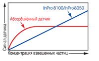 Кроме того, данный метод измерений позволяет оценить распределение взвешенных частиц по размерам. Обнаружено, что для частиц размером более 0,3 мкм наибольшая интенсивность рассеянного света регистрируется под углом 12°. Для частиц размером менее 0,3 мкм интенсивность рассеяния света одинакова практически во всех направлениях. Если при помощи второго приемника света регистрировать свет, рассеянный под углом 90°, и сравнивать его с потоком, рассеянным под углом 12°, то можно оценить и распределение частиц по размерам в анализируемом растворе (см. рисунок ниже). Максимум информации можно получить, наблюдая за процессом в динамике и контролируя увеличение или уменьшение размеров частиц во времени. Возможность одновременного контроля за количеством и размером дисперсных частиц реализована в устройстве датчика InPro 8500.