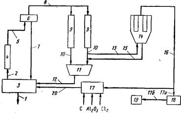 Отходящие газы после фильтра 14 содержат относительно чистый газообразный хлор и некоторые количества азота; по линии 16 их направляют к месту утилизации. Такой газообразный хлор, возможно содержащий другие хлористые соединения, может быть направлен в зону получения хлорида алюминия 17, где он реагирует с алюминийсодержащим материалом в присутствии восстановителя, например угля. По меньшей мере часть хлора и углерода в этой реакции может быть в связанном состоянии например в виде четыреххлористого углерода или карбонилхлорида. В другом варианте газообразный хлор по линии 17а можно направить в конденсатор 18 и полученный жидкий хлор по линии 17 транспортировать к месту хранения 19. Наличие линии 20, позволяет использовать хлорид алюминия, полученный в зоне 17, в том же самом или в другом электролизере 3.