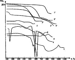 1, 2, 3, 4, 5 - кривые ДТА; Г, 2', 3', 4', 5' - кривые TG
