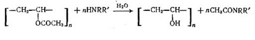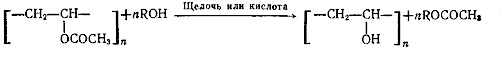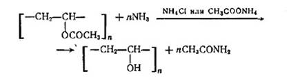 Омыление ПВА может быть осуществлено различными способами. В зависимости от природы катализатора и среды, в которой производится реакция, различают алкоголиз, гидролиз, аминолиз и аммонолиз ПВА. Эти реакции протекают по следующим схемам: