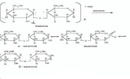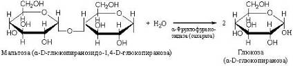 глюкозидной связи (см., напр., схему в ст. О-Гликозидгидролазы). При приготовлении дрожжевого теста дрожжи разлагают крахмал с помощью амилазы до ди- и трисахаридов, которые потом используются в жизнедеятельности, образуя в результате спирт, углекислый газ (CO2