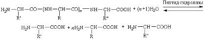 Пептид-гидролазы. Ферменты этого подкласса ускоряют гидролиз пептидных связей в белках и пептидах, при определенных условиях также синтез пептидных связей. Химизм процесса гидролиза белков и пептидов при участии пептид-гидролаз можно выразить следующей схемой: