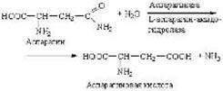 Аспарагиназа и глутаминаза укоряют гидролиз амидов дикарбоновых кислот – аспарагиновой и глутаминовой, например: