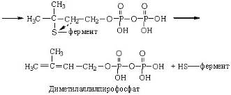 Изопентенилпирофосфат-изомераза катализирует реакцию перестройки изопентилпирофосфата в диметилаллилпирофосфат, что связано с перемещением двойной связи из 3-го во 2-е положение: