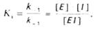 Образовавшийся комплекс, называемый фермент-ингибиторным комплексом ЕI, в отличие от фермент-субстратного комплекса ES не распадается с образованием продуктов реакции. Константу диссоциации комплекса EI, или ингибиторную константу Кi , можно, следуя теории Михаэлиса–Ментен, определить как отношение констант обратной и прямой реакций:
