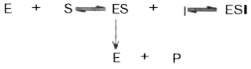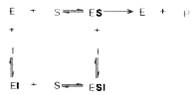 Следует указать, что неконкурентное ингибирование также может быть обратимым и необратимым, поскольку отсутствует конкуренция между субстратом и ингибитором за активный центр. Примеры необратимого ингибирования приведены ранее. При обратимом неконкурентном ингибировании субстрат S и ингибитор I связываются с разными центрами, поэтому появляется возможность образования как комплекса EI, так и тройного комплекса EIS; последний может распадаться с освобождением продукта, но с меньшей скоростью, чем комплекс ES.