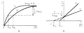 а - в координатах v от [ S ] ; б - в координатах 1/v от 1 / [ S ] ; Vmax и Vi - максимальные скорости реакции; Кm и Kmi - константа Михаэлиса соответственно в отсутствие (1) и в присутствии (2) ингибитора.