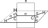 В результате каждый атом углерода обладает тремя гибридными sp2 -орбиталями, оси которых находятся в одной плоскости под углом 120º друг к другу, и одной негибридной гантелеобразной p-орбиталью, ось которой расположена под прямым углом к плоскости осей трех sp2 -орбиталей. Одна из трех гибридных орбиталей атома углерода перекрывается с подобной орбиталью другого атома углерода, образуя - связь. Каждая оставшаяся гибридная орбиталь атомов углерода перекрывается с s- орбиталью атомов водорода, приводя к образованию в той же плоскости четырех - связей C–H. Две негибридные p- орбитали атомов углерода взаимно перекрываются и образуют - связь, максимальная плотность которой расположена перпендикулярно плоскости - связей. Следовательно, двойная связь алкенов представляет собой сочетание - и - связей.