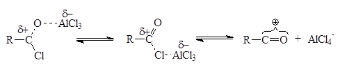 В случае реакции ацилирования в качестве ацилирующего агента как правило применяются ацилхлориды в присутствии кислот Льюиса (чаще всего хлорида алюминия). В таком случае реакция начинается с взаимодействия ацилхлорида с катализатором с образованием собственно электрофильного агента: