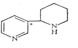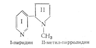 Никотин, алкалоид, содержащийся в табаке (до 8%), а также в растениях некоторых других родов; производные пиридина. При курении табака никотин возгоняется, проникает в дыхательные пути и, всасываясь, действуют на ганглии вегетативной нервной системы и на т. н. холинреактивные структуры центральной и периферической нервной системой. В малых дозах никотин действует возбуждающе на нервную систему, в больших вызывает ее паралич. Никотин это один из самых ядовитых алкалоидов: несколько капель (100-200 мг, т.е. количество, содержащееся в 200 г табака) при в ведении в человека вызывают смерть[3], а ПДК никотина в воздухе составляет 0,5 мг/м3 [5].