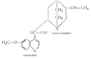 Хинин представляет белые кристаллы, в безводном состоянии плавящиеся при 175°, а из воды выделяющиеся с 3 молекулами кристаллизационной воды. Соли его очень горьки на вкус и обладают в растворе прекрасной синей флуоресценцией. Хинин- важнейшее средство против малярии и вообще жаропонижающее; применяется обыкновенно в виде средней сернокислой или хлористоводородной (с одной молекулой НСL) соли.