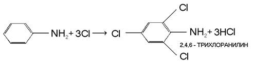 Некоторые особые свойства анилина обусловлены наличием в его молекуле ароматического ядра. Так, анилин легко взаимодействует в растворах с хлором и бромом, при этом происходит замещение атомов водорода в бензольном ядре, находящихся в орто - и пара -положенияхк аминогруппе: