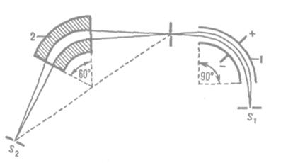 Якби фокусування іонів було ідеальним, то у випадку мас-аналізатора, у якого X1 = X2 (мал. 3), σ1 було б у точності рівним ширині щілини джерела S1 . У дійсності σ 1 >S1 , що зменшує роздільну здатність пристрою. Однією із причин розширення пучка є розброс у кінетичній енергії іонів, що вилітають із іонного джерела. Це в більшій або меншій мірі неминуче для будь-якого іонного джерела. Іншими причинами є: наявність у даного пучка значної розсіюваності, розсіювання іонів в аналізаторі через зіткнення з молекулами залишкового газу, відштовхування іонів у пучку через однойменність їхніх зарядів. Для ослаблення впливу цих факторів застосовують „похиле входження ” пучка в аналізатор і криволінійні границі магнітного поля. У деяких мас-спектрометрах застосовують неоднорідні магнітні поля, для зменшення розсіювання іонів прагнуть створити в аналізаторі високий вакуум (10-8 мм рт. cm. у приладах із середньою й високою величиною R). Для ослаблення впливу розбросу по енергіях застосовують прилади з подвійним фокусуванням, які фокусують на щілину S2 іони з однаковими m/е, що вилітають не тільки по різних напрямках, але й з різними енергіями. Для цього іонний пучок пропускають не тільки через магнітне, але й через електричне поле, що відхиляє частинки (мал. 4).