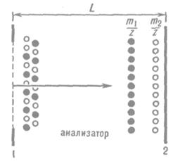 У час-пролітному мас-спектрометрі (мал. 5) іони утворяться в іонному джерелі дуже коротким електричним імпульсом й «впорскуються» у вигляді «іонного пакета» через сітку 1 в аналізатор 2, що представляє собою еквіпотенціальний простір. «Дрейфуючи» уздовж аналізатора в напрямку до колектора іонів 3, вихідний пакет «розшаровується» на ряд пакетів, кожний з яких складається з іонів з однаковими m/е. Розшарування обумовлене тим, що у вихідному пакеті енергія всіх іонів однакова, а їхньої швидкості й, отже, часи прольоту t аналізатора обернено пропорційні