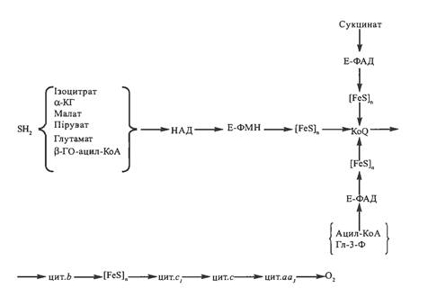 У процесі розщеплення поживних речовин від субстратів шляхом окислення відщеплюються протони й електрони. Вони надходять на коферменти ферментів дегідрогеназ, які локалізовані у внутрішній мембрані мітохондрій і утворюють дихальний ланцюг - сукупність молекулярних компонентів (ферментів, коферментів, додаткових електроно-транспортних білків), що здійснюють дегідрування органічних субстратів та послідовний перенос відновлювальних еквівалентів (протонів та електронів) на кисень через ряд проміжних переносників - транспортерів протонів та електронів (мал. 1); звільнена при переносі електронів по дихальному ланцюгу енергія запасається в пірофосфатних зв'язках АТФ. Реакції дихального ланцюга каталізують головним чином три групи окислювально-відновних ферментів: 1) піридинзалежні дегідрогенази; 2) флавін-залежні дегідрогенази; 3) цитохроми [1].