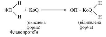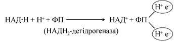 Другий етап полягає в переносі по дихальному ланцюгу двох атомів водню від відновленої форми НАДH+H+ на флавопротеїни - проміжні переносники атомів водню. Загальну реакцію другого етапу біологічного окислення можна зобразити так (мал. 5):