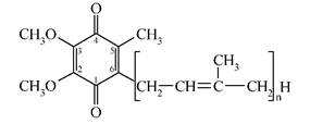 Коензим Q (убіхінон) – подібно α-токоферолу жиророзчинний і проявляє АО-активність, утворюючи окислювально-відновну буферну систему убіхінол-убіхінон. Молекула убихінону складається з бензохінонової частини (ядра) і бокового ланцюга, що має ізопреноїдну структуру: