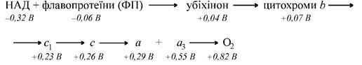 Напрямок переносу протонів і електронів визначає окислювально-відновний потенціал. Кожен компонент дихального ланцюга у внутрішній мембрані мітохондрій вбудований між своїм відновником і окисником і може віддавати свій водень або свої електрони іншому компоненту, який має більш високий потенціал. Ця послідовність виглядає так (мал. 8):