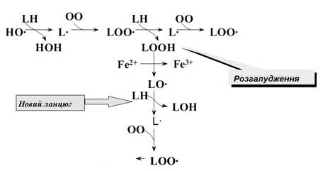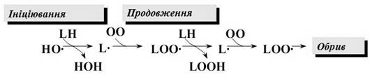Ланцюгова реакція ПОЛ протікає в декілька стадій, які одержали назву ініціювання, продовження і обрив ланцюгу (мал. 9).