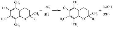Головна АО-функція токоферолу полягає в тому, що він завдяки наявності в молекулі лабільного атома водню взаємодіє з пероксидними радикалами ліпідів, відновлюючи їх у гідропероксиди і перериваючи, таким чином, ланцюгову реакцію пероксидації [10]: