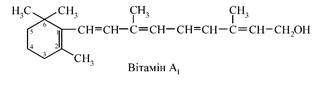 Вітамін А (ретинол, ретиналь, ретиноїва кислота) та його провітаміни β–каротин та інші каротиноїди. Під назвою вітамін А об'єднується група похідних рослинних пігментів - каротинів. З хімічної точки зору ретинол являє собою циклічний ненасичений одноатомний спирт, який складається із шестичленного кільця (β-іонона), двох залишків ізопрену та первинної спиртової групи. Вітамін А2 відрізняється від А1 наявністю додаткового подвійного зв'язку в положенні 3-4 кільця циклогексану. Вітаміни А1 і А2 мають однакову біологічну дію і фізико-хімічні властивості, проте вітамін А2 є менш активним. Основною структурною особливістю, обумовлюючою хімічну і біологічну, зокрема, АО-активність є наявність системі спряжених, одинарних і подвійних зв’язків, що чергуються, між атомами вуглецю: