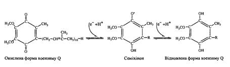 Основна коферментна роль убіхінону полягає в тому, що, розчиняючись у ліпідах гідрофобної частини мембран мітохондрій, він здійснює перенос електронів і протонів, дифундуючи від внутрішньої до зовнішньої поверхні внутрішньої мембрани. Загальну реакцію третього етапу можна зобразити так (мал. 7):