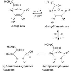 Система аскорбінової кислоти (АК). При окисленні АК зазнає дегідрування з утворенням дегідроаскорбінової кислоти (ДАК). Перехід здійснюється через проміжну стадію нестійкого інтермедіату – семідегідроаскорбату (аскорбілу). При наступному необоротному окисленні утворюється дикетогулонова кислота. АК метаболічно високоактивна, тоді як аскорбіл-радикал – перший продукт її окислення – відносно інертний і може брати участь в окислювально-відновних реакціях [12]: