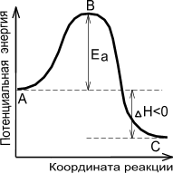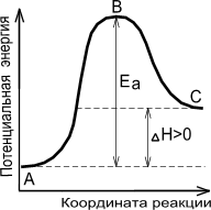 А - реагенты, В - активированный комплекс (переходное состояние), С - продукты.