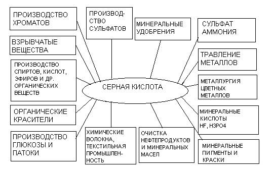 Серная кислота – наиболее сильная и самая дешевая кислота. Среди минеральных кислот, производимых химической промышленностью, серная кислота по объему производства и потребления занимает первое место. Серная кислота не дымит, в концентрированном виде не разрушает черные металлы, в то же время является одной из самых сильных кислот, в широком диапазоне температур (от –40…-20 до 260 – 336,50 С) находится в жидком состоянии. Она широко используется в производстве минеральных удобрений, различных солей и кислот, всевозможных органических продуктов, красителей, дымообразующих и взрывчатых веществ и т.д. Серная кислота находит разнообразное применение в нефтяной, металлургической, металлообрабатывающей, текстильной, кожевенной и других отраслях промышленности, используется в качестве водоотталкивающего и осушающего средства, применяется в процессах нейтрализации, травления и т.д. Наиболее важные области применения серной кислоты отражены на схеме.