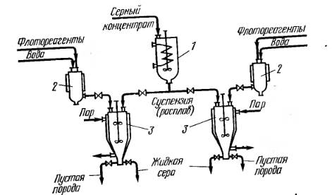 Рис. 2.1.Схема получения серы из серных концентратов флотацией в автоклавах:1 - плавильник, 2 - сборники растворов флотореагентов, 3 - флотационные автоклавы