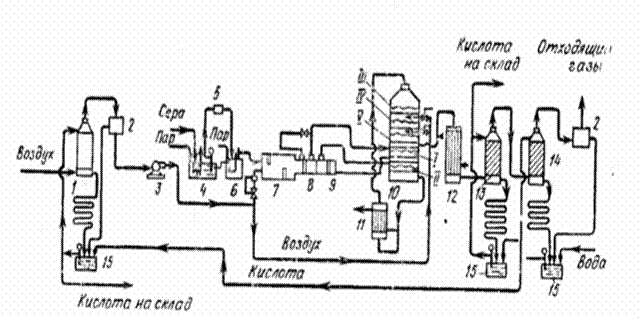 За последние годы в процессе производства серной кислоты внесены существенные улучшения. Широко применяется обжиг колчедана в кипящем слое и сжигание серы в циклонной печи, значительно увеличивается использование тепла, выделяющегося при обжиге сырья, и на других стадиях производства серной кислоты. Непрерывно повышается производительность башенных сернокислотных систем в результате поддержания оптимального технологического режима, разработанного на основе исследований; интенсивность башенных систем достигает 250 кг/м3 в сутки. Освоен контактно-башенный процесс производства серной кислоты, при котором расход HNO3 составляет 6 – 7 кг на 1 тонну H2 SO4 .