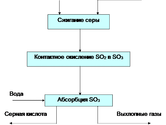 В настоящее время серная кислота производится двумя способами: нитрозным, существующим более 200 лет, и контактным, освоенным в промышленности в конце ХIХ и начале ХХ века. Контактный способ вытесняет нитрозный (башенный). Первой стадией сернокислотного производства по любому методу является получение диоксида серы при сжигании сернистого сырья. После очистки диоксида серы (особенно в контактном методе) ее окисляют до триоксида серы, который соединяют с водой с получением серной кислоты. Окисление SO2 в SO3 в обычных условиях протекает крайне медленно. Для ускорения процесса применяют катализаторы.