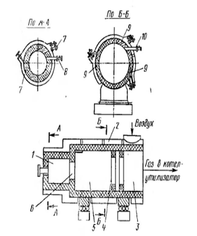 Серу подают в торцевую часть печи форсунки 6. Сюда же вводится воздух для горения. Дополнительный (вторичный) воздух поступает через отверстие в корпусе печи. Сора сгорает во всем объеме печи, а для лучшего перемешивания газа внутри печи установлены перегородки 4 из огнеупорного кирпича.