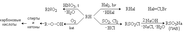 Под действием смеси оксида серы (IV) и хлора при УФ-облучении из алканов образуются алкилсульфохлориды: