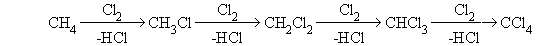 Хлорирование, как правило, не удается остановить на стадии монозамещения. Так, при хлорировании метана образуется смесь продуктов моно- и полихлорирования: