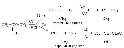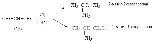 Если алкан имеет более сложное строение, то возможно несколько направлений замещения с образованием изомерных моногалогенпроизводных. Например, при хлорировании изобутана образуется смесь двух монохлорпроизводных: