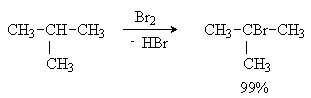 Таким образом, реакции хлорирования протекают неселективно с образованием смеси продуктов замещения. Бромирование алканов, в отличие от хлорирования, протекают региоселективно, так как радикалы брома обладают существенно меньшей реакционной способностью. Например, бромирование изобутана в таких условиях протекает с образованием исключительно 2-бром-2-метилпропана: