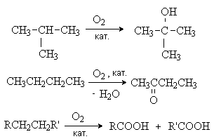 Из гидропероксидов далее в зависимости от условий реакции образуются спирты, кетоны, карбоновые кислоты. В реакции принимают участие наиболее реакционноспособные третичные или вторичные С-Н связи: